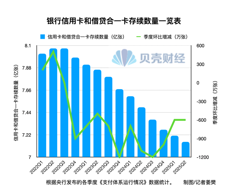 凭证央行吐露的数据,自2022年四季度以来,银行信誉卡以及借贷合一卡的存续数目不断上涨,已经从2022年三季度末峰值时的7.98亿张,上涨至往年二季度末的7.15亿张。近一年来,银行信誉卡以及借贷合一卡已经削减3400万张。