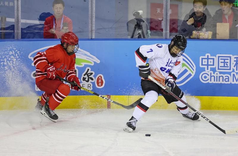 在上个月举行的十四冬角逐中,周子简(右)地址的北京男冰青年队对于阵黑龙江队。 最新往事记者 王飞 摄