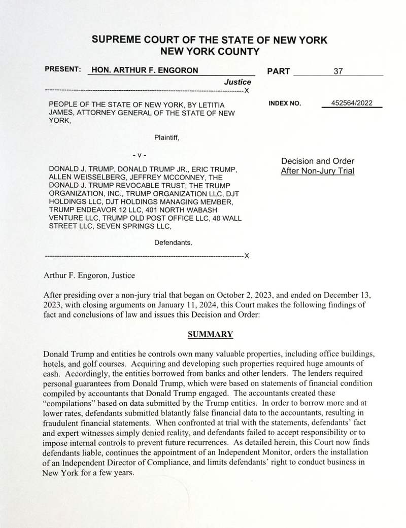 2月16日,恩戈隆作出了讯断。据美国有线电视往事网(CNN)报道,恩戈隆的讯断书长达92页,特朗普以及他的特朗普总体被判罚款3.55亿美元,他的两个儿子小唐纳德·特朗普以及埃里克·特朗普辩解被判400万美元罚款,特朗普总体前首席财政官艾伦·韦斯伯格被判100万美元罚款。因此,此案多名原告累计罚款金额逾越4.5亿美元。