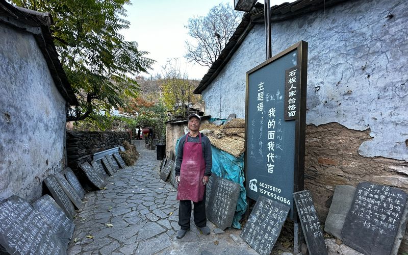 杨守安一手扶着石板、一手握着粉笔,脸上子细的模样以及在做农活的时候残缺差距。由于石板写诗被公共熟知,他被叫做“石板爷爷”,小小的面馆也成为了城里游客的打卡地。他说:“石板路、石板房,水峪村落子到处都是石板的影子……这是咱们水峪村落子的特色,也是水峪横蛮的载体。”