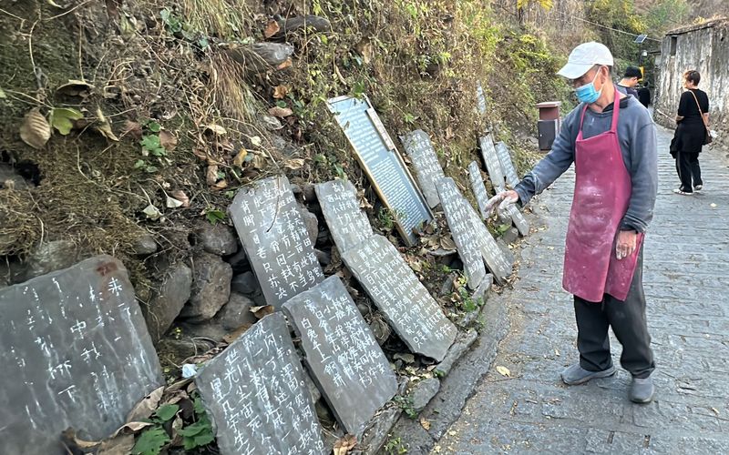途经的游客在看杨守安的石板诗。最新往事记者 王巍 摄