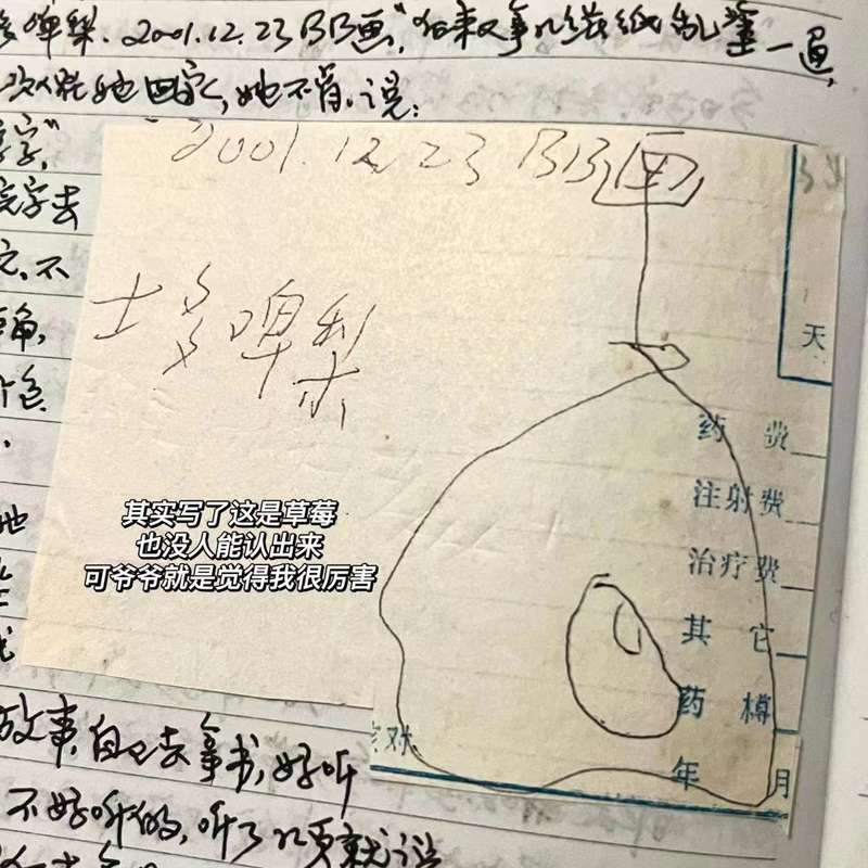 2001年12月23日,她在一张纸上画下一个图案。如今谁也认不进去这是甚么,而爷爷特意把这张纸剪贴到了日志本里,并在一旁标注,“士多啤梨”(草莓)。“彷佛爷爷总是感应我很强烈。”陈潞说,小时候吃糖,她把糖纸丢在爷爷手上,他也在日志本记下一句,“LL很强烈,知道糖纸不能乱丢。”
