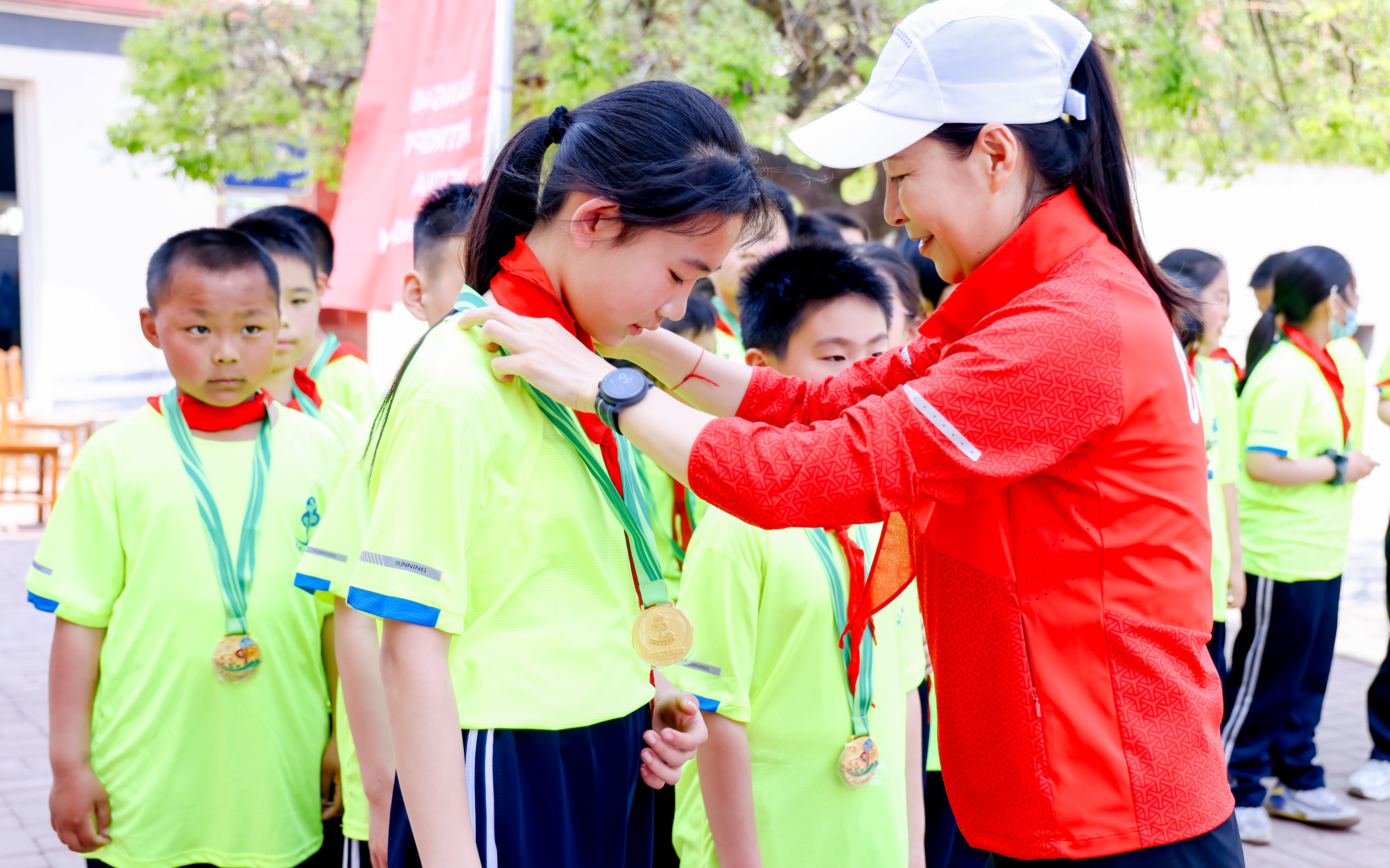 奥运会冠军王丽萍为学生佩戴奖牌。