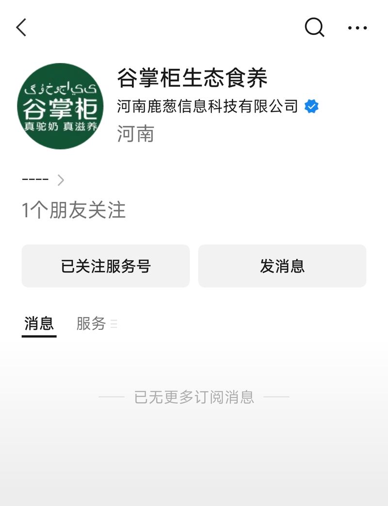 “谷掌柜生态食养”微信公共号内容也已经被清空。 微信公共号截图