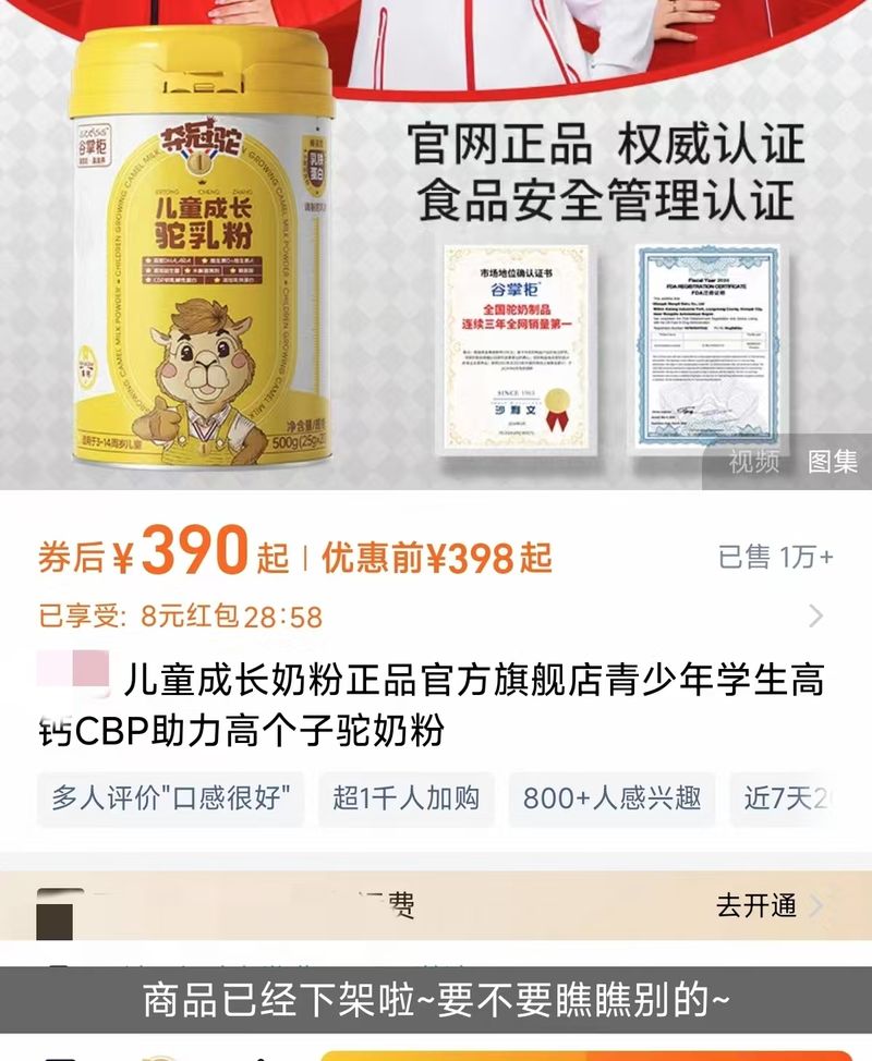 谷掌柜已经将涉事“骆驼奶片”“儿童拦阻驼奶粉”下架。 电商平台截图