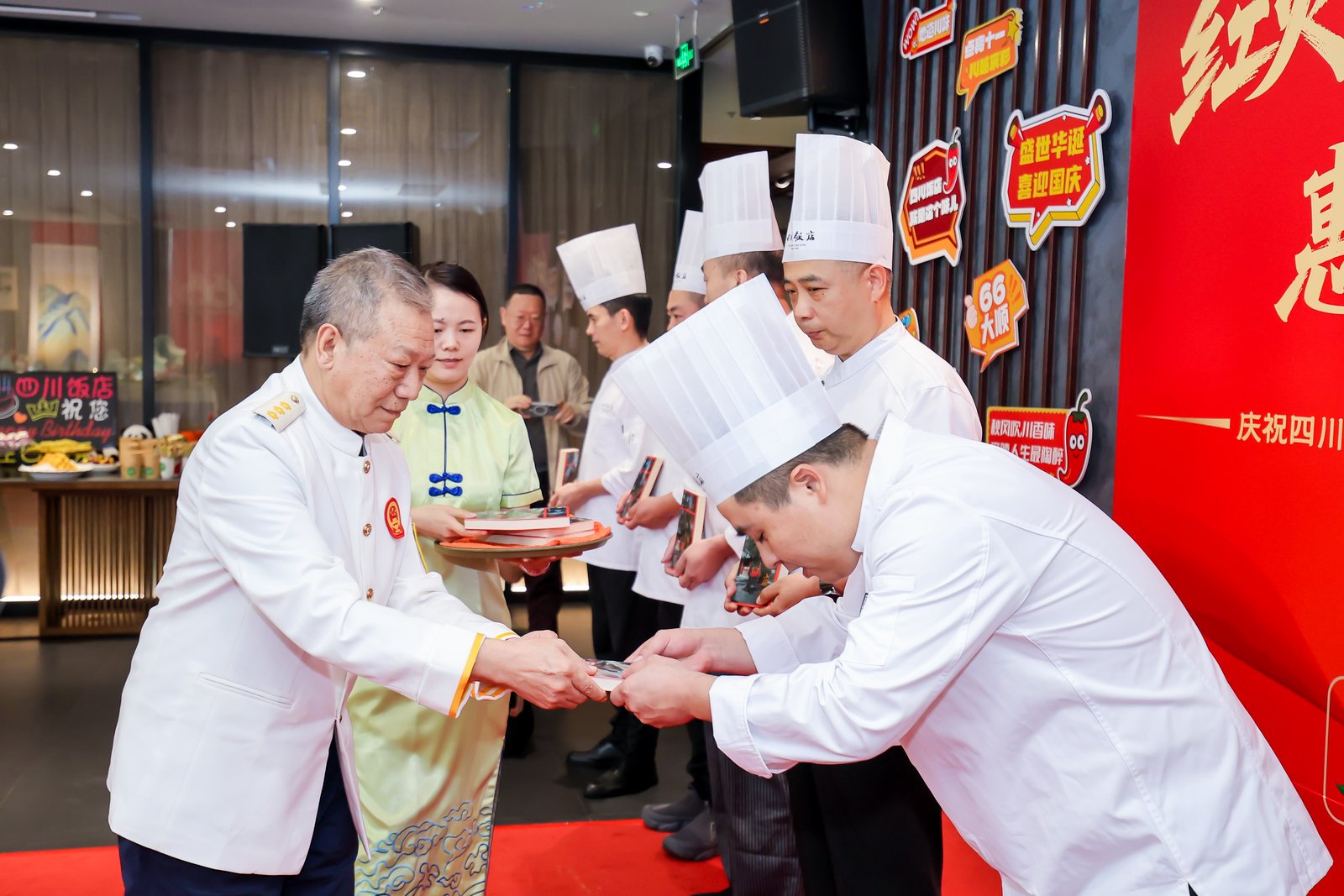 四川饭馆第二代传承人、川菜巨匠于建夷易近向新一代厨师代表赠予《四川饭馆老菜谱》。新往受访者供图