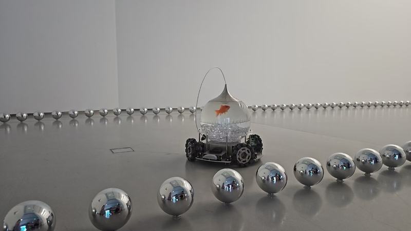 《我是一只鱼》是一个可能在陆地上逍遥挪移的鱼缸机械人,鱼的每一次游动都直接影响鱼缸的挪移倾向(商重明/摄)。