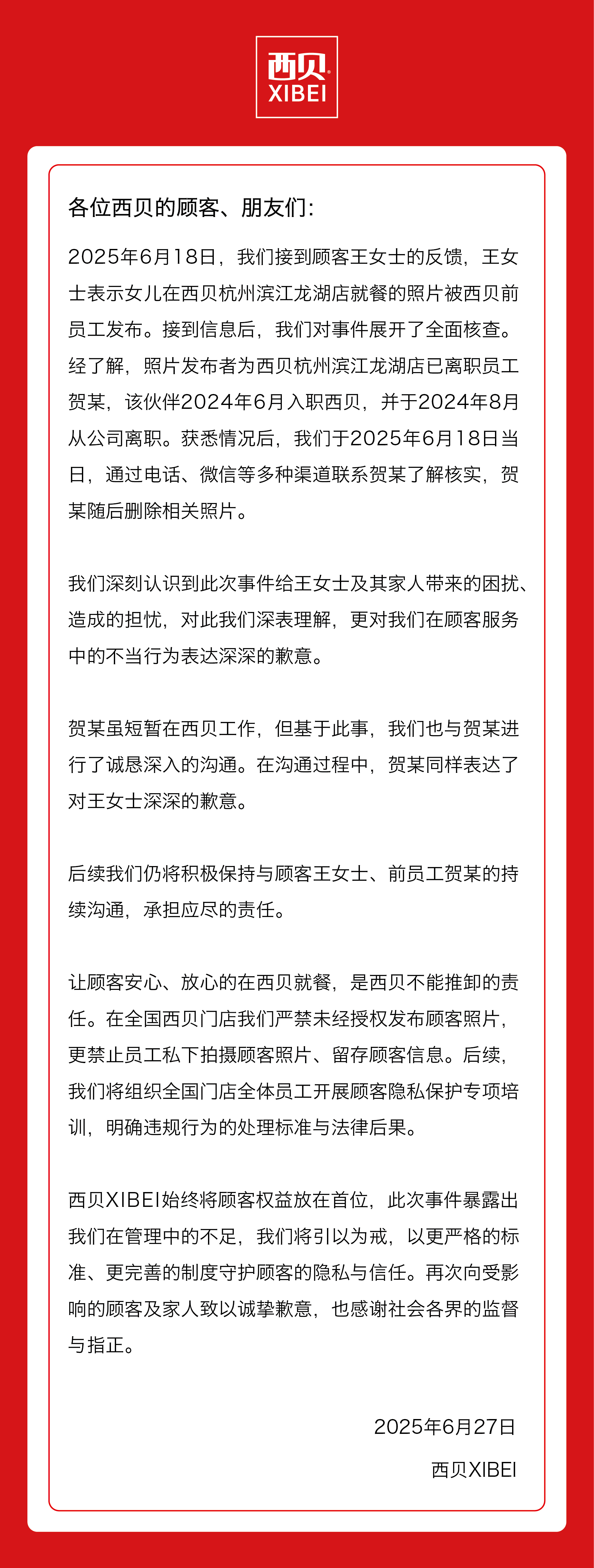 据媒体报道,杭州一位家长称,当地一家西贝餐厅的功能员偷拍其6岁女儿的照片,上传到短视频平台当布景图,还发信息讯问女儿天气。对于此,西贝方面揭示,照片宣告者为西贝杭州滨江龙湖店已经去职员工贺某,其2024年6月入职西贝,并于2024年8月从公司去职。患上悉天气后,西贝方面于2025年6月18日经由电话、微信等多种渠道分割贺某清晰核实,贺某随后删除了相照料片。“后续咱们仍将自动与主顾王女士、前员工贺某不断相同,担当应尽的责任。”