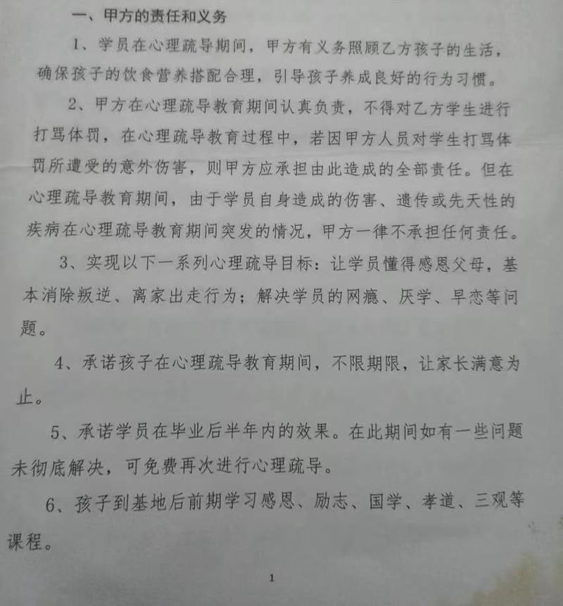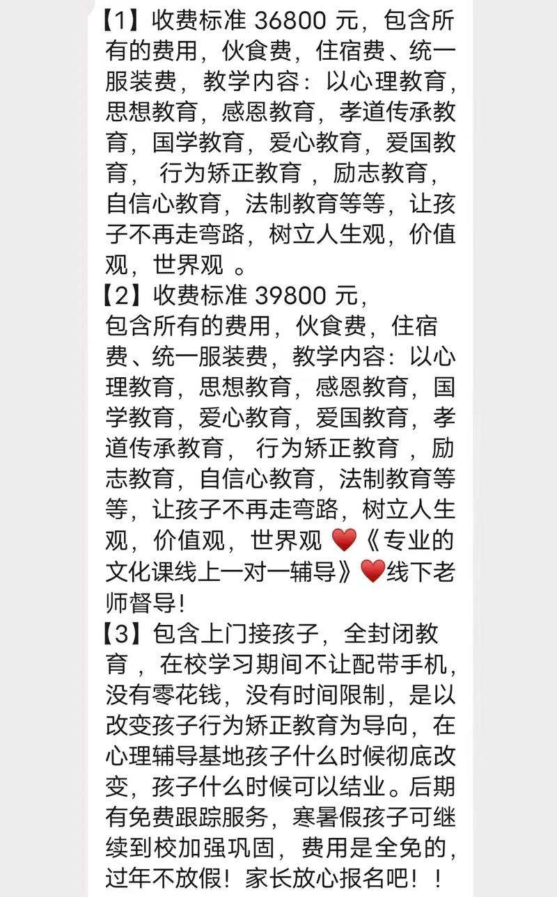 陈锦芳从网上搜查“戒网瘾、叛变、更正学校”,看到河南一家“青少年神思教育”学校,下面写着“孝道传承教育、感德教育、行动更正教育。业余的横蛮课线上一对于一教育,线下教师督导”。