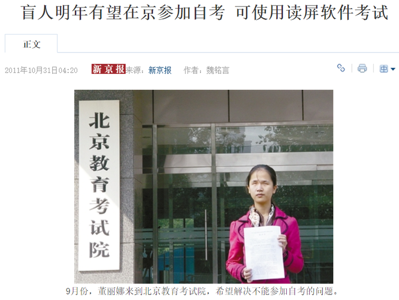 “我的身段天气我最清晰。”不接受这一功能的董丽娜在公益状师的帮手下又给北京市教委收回了《对于北京市教育磨难院谢绝盲人退出自考的歌咏信》。同时,一些媒体也对于她的报考蒙受拦阻报道,她的不懈坚持不光取患了公共关注及行动反对于,也最终感动了北京教育磨难院。