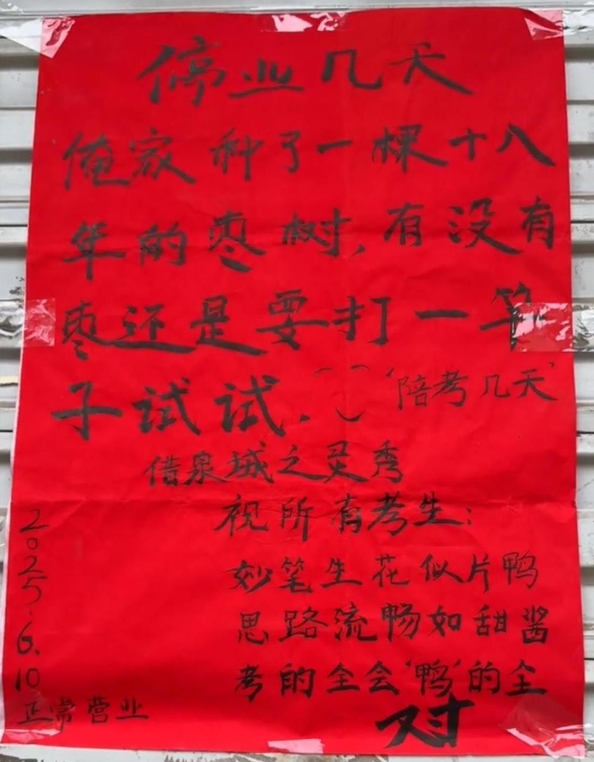 先后两则通告中,一位父亲对于女儿高考的体贴与对于功能的宽绰广漠豪爽豪爽跃然纸上。独出心裁的打油诗,既转达出对于孩子前途的松散以待,又暗含“尽人事而安定命”的通透,修筑了一种幽默幽默的败坏感。有网友跟帖,“这哪是歇业通告,清晰是一位父亲藏在烟火气里的暖以及浪漫啊”,可能说颇为精准到位了。