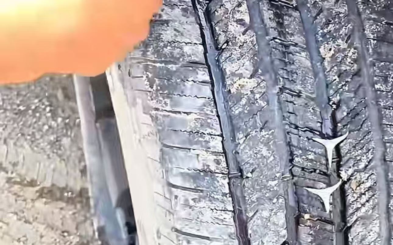 ▲车轮胎上扎进去的钉子。图/社交账号“探寻荒原宝藏地-大鹏”视频截图