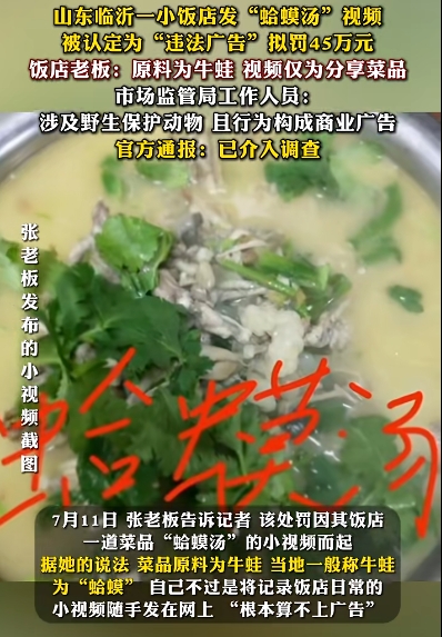 ▲山东临沂一小饭馆发“虾蟆汤”视频被认定为“违法广告”,激发了争议。拍菜品视频被图/群集视频截图