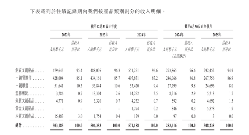 2022年至2024年以及2025年上半年,杭州铜徒弟的铜质文创产物的支出辩解约为4.8亿元、4.88亿元、5.51亿元、2.93亿元,辩解占同期总支出的95.4%、96.3%、96.6%及94.9%。