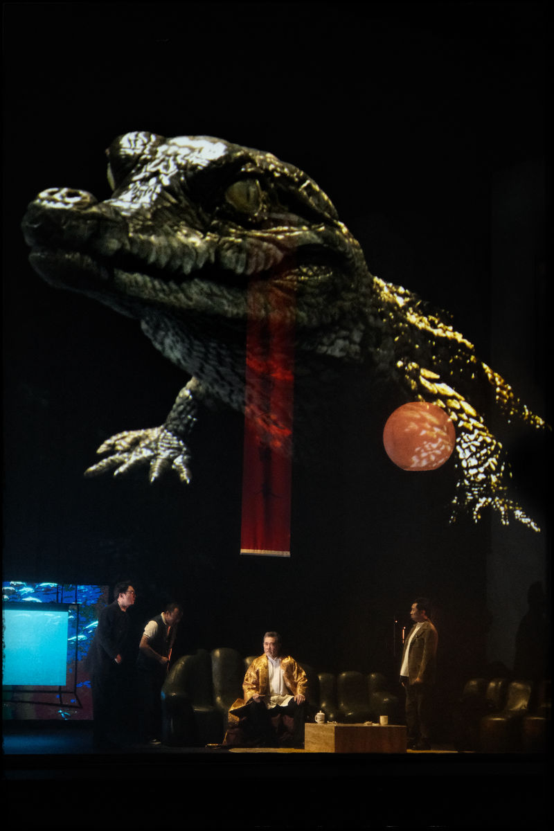 一条玄色、严正的鳄鱼简直重新至尾并吞着舞台布景的中间位置。