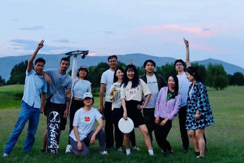 在大理寄居的数字游夷易近们玩飞盘,持红色飞盘者为Nian。受访者供图