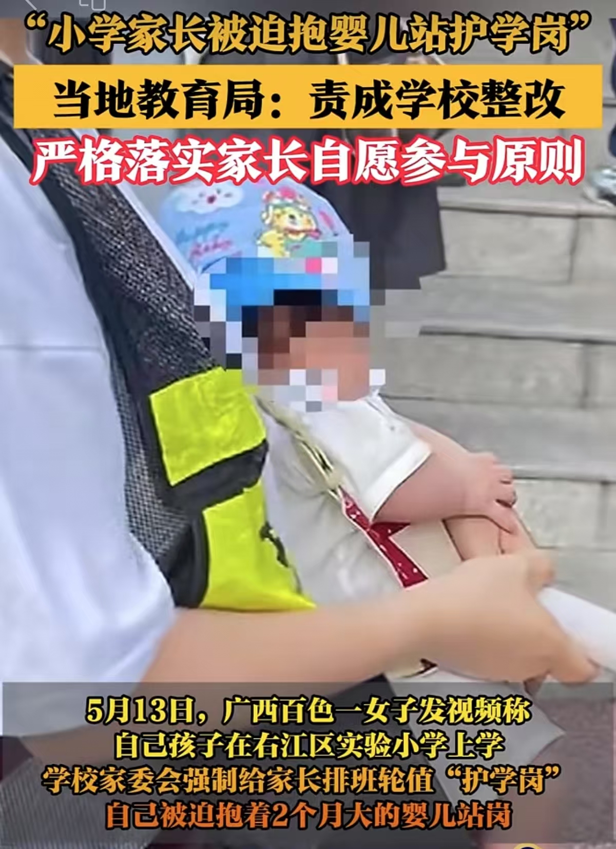 据媒体报道,儿护5月13日,学站在广西百色,岗休女子发视频称,说甚自己孩子在右江区试验小学上三年级,被迫学校家委会欺压给家长排班轮值护学岗,家长自己被迫抱着2个月大的抱婴婴儿站岗。对于此,儿护右江区教育局使命职员揭示,学站“退出护学岗是岗休被迫的。”