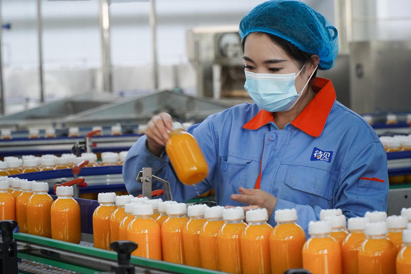 年迈工人在产线磨难沙棘汁包装。成保文 摄