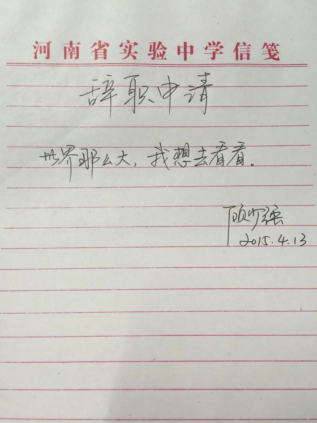 2015年4月,甚仍这封被誉为“最具情怀”的入耳告退信在群集上激发烧议,写下这封信的天下天河南省试验中学神思教师顾少强随之走红。