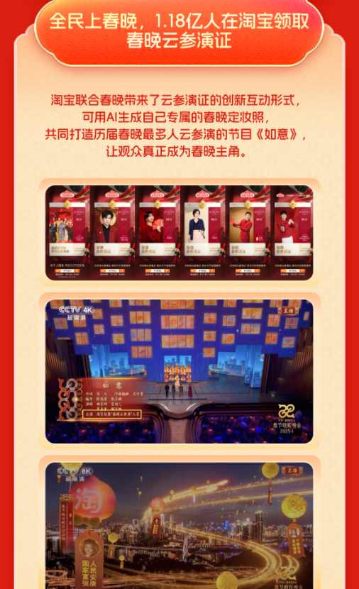 以淘宝往年推出的云参演证为例,用户惟独掀开淘宝App搜查“一起上春晚”,许下愿望就能支出“春晚云参演证”,还能用AI天生自己专属的春晚定妆照,并经由《如意》节目亮相春晚。