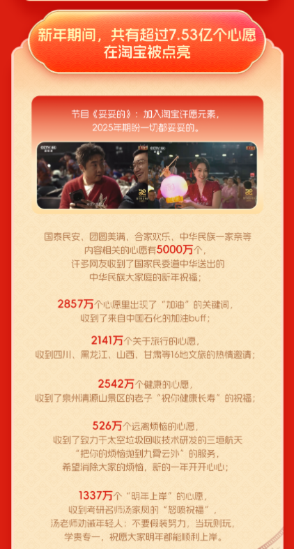 此外淘宝还推出了新年许诺行动,人们在这里累计许诺7.53亿次。在人们许下的愿望中,有“身段康健、阖家哀痛”,也有“国泰夷易近安、发达发达”,小愿望以及大妄想互动,佳节喜庆与家国情怀同构。人们在旁不美不雅春晚的同时,也以一种浑朴、隧道的方式,进入了全夷易近退出的语境之中。