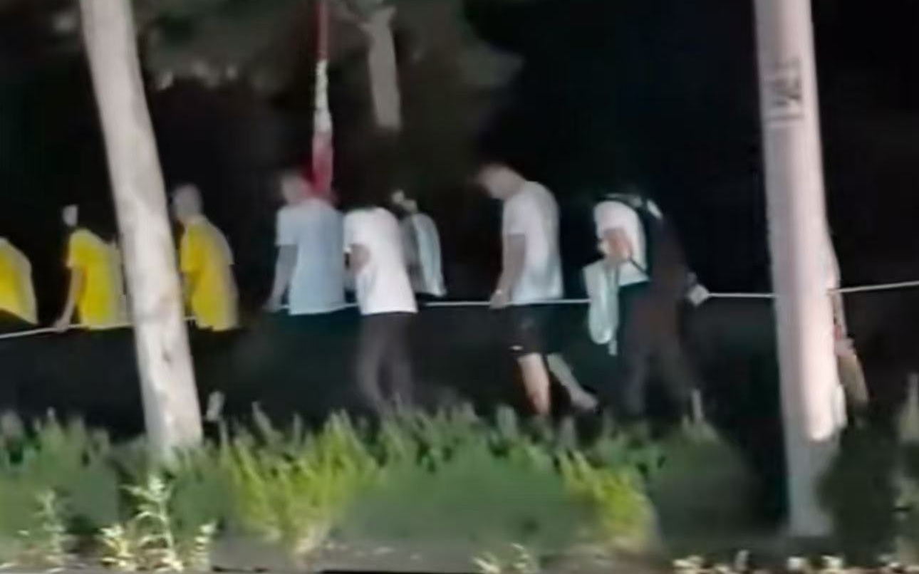 ▲一景区内,数十人蒙眼排队行走。蒙眼图/社交平台视频截图