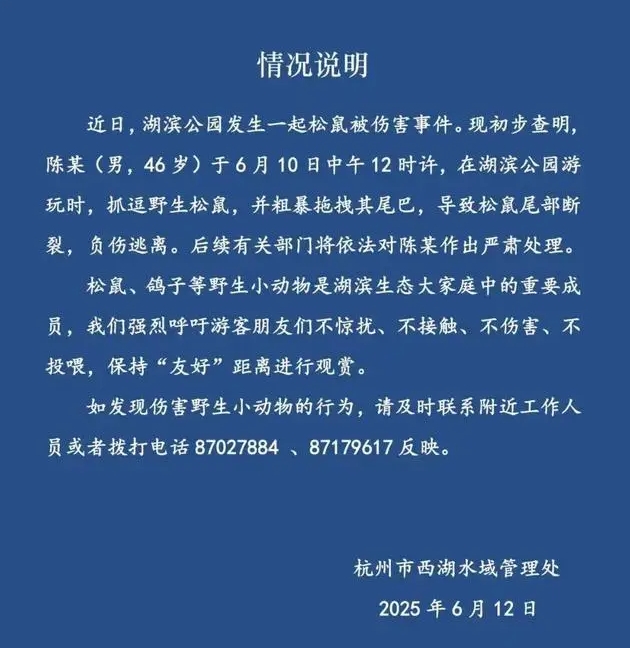 据潮往事报道,粗豪使命爆发后,西湖水域规画处对于此拦阻核实审核并宣告天气合成称,经开始查明,陈某(男,46岁)于6月10日三更12时许,在湖滨公园顽耍时,抓逗家养松鼠,并粗豪拖拽其尾巴,导致松鼠尾部断裂,挂花逃离。后续无关部份将依法对于陈某作出严正处置。