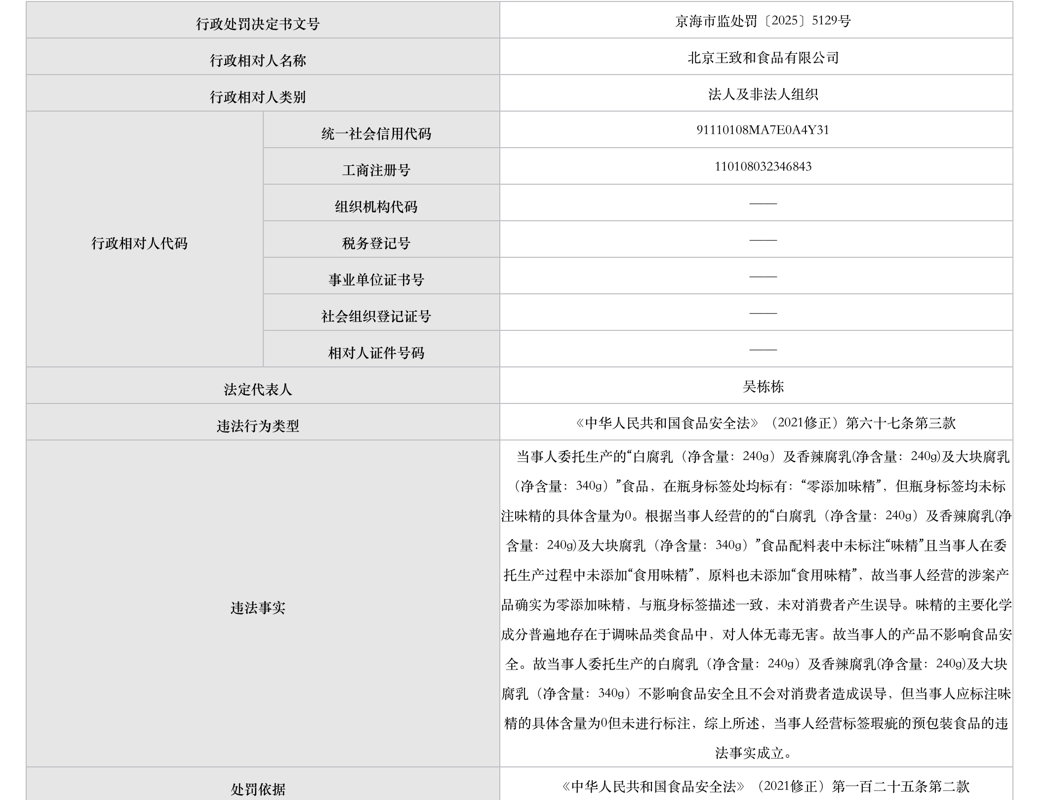 北京市市场坚守规画局宣告的行政处分抉择书揭示,王致以及腐乳产物存在标签瑕疵。乳产北京市市场坚守规画局官网截图