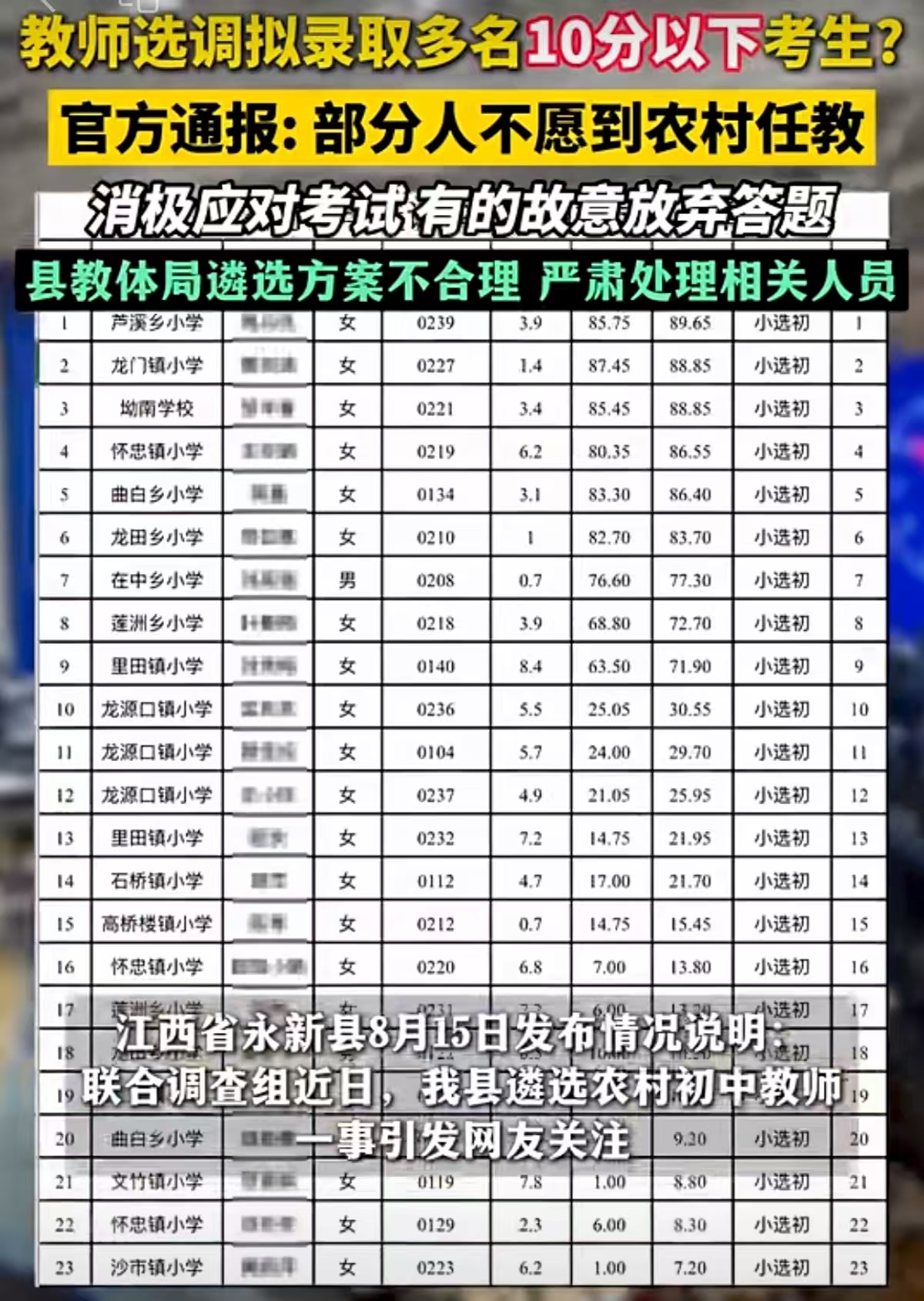 ▲江西永新县选调村落子子初中教师,拟落选多名10分如下考生一事激发网友关注。选分下考图/湖北日报视频截图