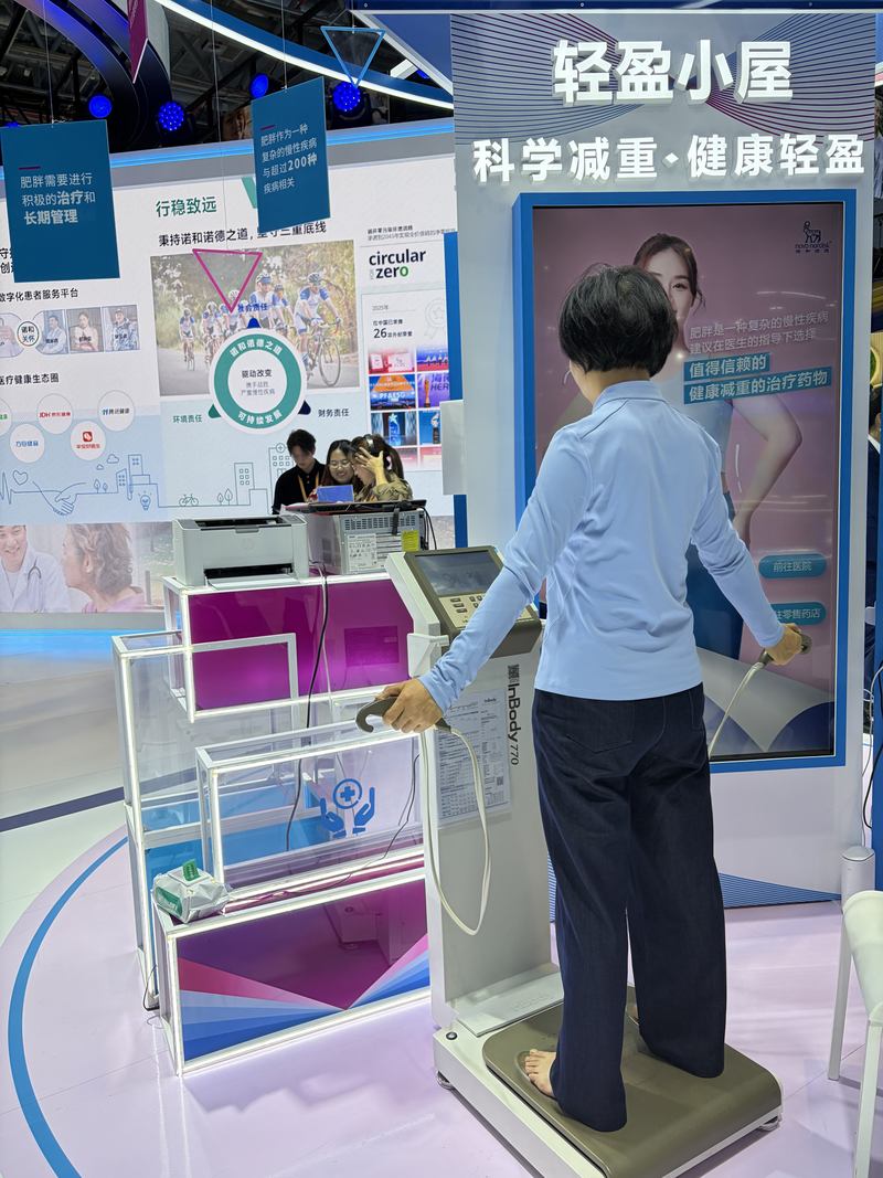诺以及诺德则在进博会展台打造了首个聚焦虚弱症规画的沉浸式体验空间——轻捷小屋,经由“认知提升、迷信治疗、临时规画”全周期场景的体验,削减公共从“自动接管虚弱症知识”向“自动学习以及自动规画虚弱症”转变,用愈加沉闷的互动体验,提升公共对于虚弱症迷信诊疗以及临时规画的认知。在“认知提升”场景中,公共可经由AI视觉识别互动技术望见“变胖的自己”,散漫照应的科普知识及康健危害揭示,叫醒对于虚弱症的看重。“迷信治疗”部份收罗医院与批发两大场景,旨在揭示“院店协同”新方式,助力买通虚弱症院内外规画闭环,提升虚弱症规画的利便性、迷信性与克制性。该地域摆放了一台人体成份分解仪,罗致了良多人立足测试。“临时规画”是虚弱症全病程规画的紧迫一环,该场景依靠诺以及诺德数字化患者功能平台“诺以及体贴”,揭示了数字化处置妄想在虚弱症临时规画中的紧迫熏染。