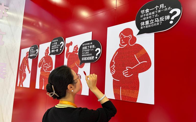 礼来在本届进博会上推出“身段抵抗解码展”,以可视化方式揭示减重历程中的“代谢顺应”机制——当体重上涨,身段可能启动“进食方式”与“节能方式”,导致食欲失控、平台期顽强、行动下场受限,减重及其临时坚持变患上颇为难题。鉴赏者需手持一个红色的小圆片,便能看清墙上四副“胖人图”上的翰墨,清晰代谢顺应机制。该展览旨在突破“减重失败源于意志单薄”的机械印象,夸诞这一顺境眼前目今是常被轻忽的神思机制“身段抵抗”。因此,谋求业余的医学干涉以清晰并破解这一机制变患上至关紧迫。礼来还特意部署了一个严正的被黄色丝带捆绑的充气红色人偶,以此揭示减重历程中所蒙受的多重顺境。