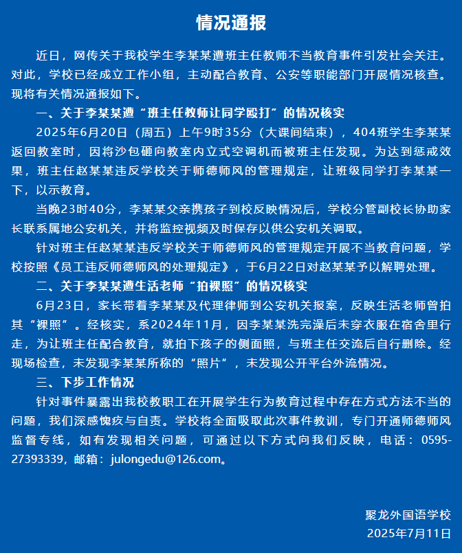 ▲7月11日,福建泉州聚龙外国语学校宣告天气传递。任让图/泉州聚龙外国语学校微信公共号