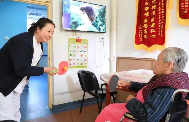 护士长孟伟在肉体神思一科病房以及患病老人打乒乓球。受访者供图