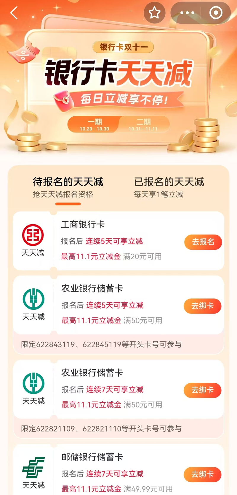 之后,支出宝已经推出“银行卡天天减”行动,有收罗建树银行、工商银行、农业银行等国有大行退出,也有宁波银行、上海银行、杭州银行等城商行退出,部份报名后不断5天可享立减,亦有部份报名后不断22天可享立减。