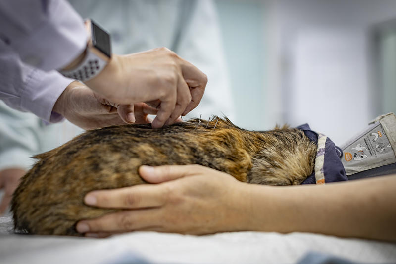 她先用双手重握住小花的腹股沟处诊脉;又挨近小花的身段,听听声音,闻闻气息;再偏远拨开背上的毛看看皮肤,拨开嘴巴看看舌头;最后问一问西崽小花艰深的形态。望闻问切后,针灸是当天诊疗的最后一步。