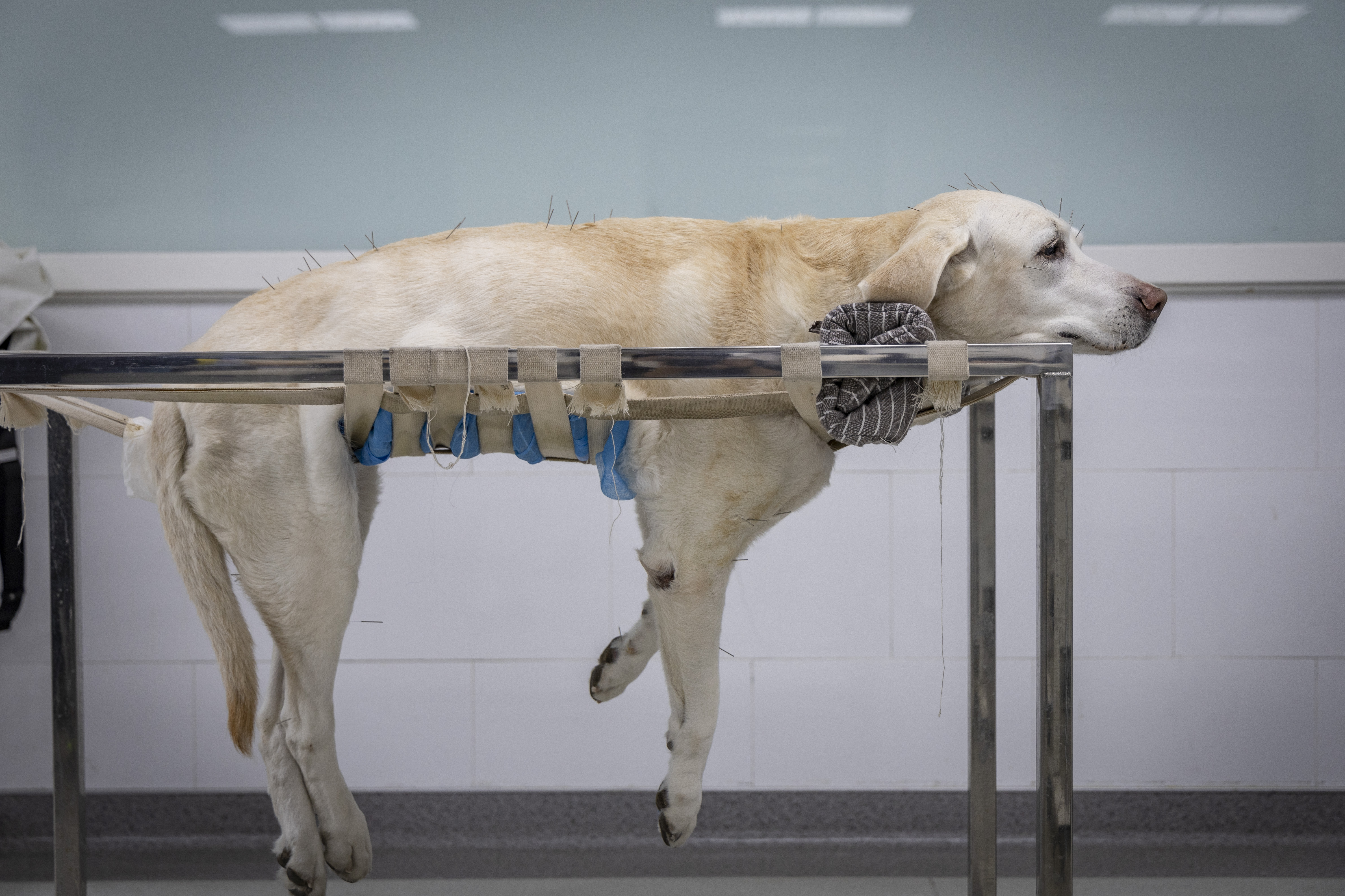 大型犬可能趴在针灸架上,小的猫狗则是趴在桌子上。一只病患艰深多少多分钟就能扎完,之后留针半小时。“扎上针灸后,它们处于舒缓的形态,良多都玄色常呐喊的。有些宠物西崽导致反映,每一次到了要来治疗的时候,自家宠物会揭示出颇为期待、很想出门的模样。”