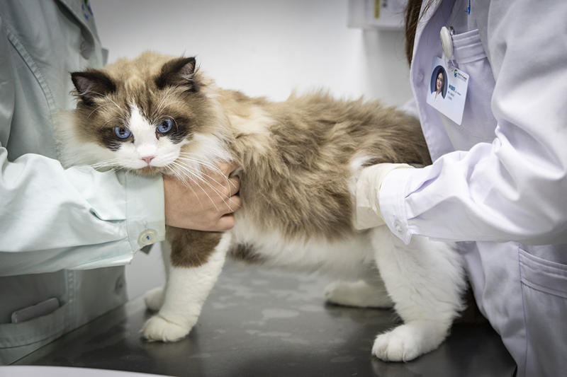 医生正在给患病的猫诊脉。