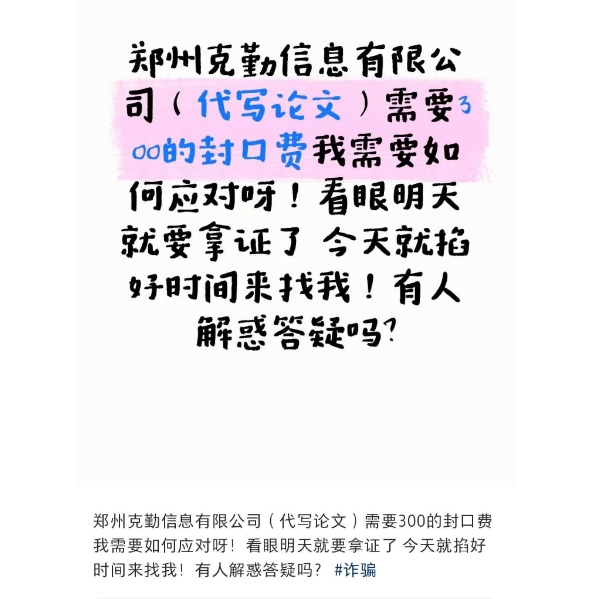 克日,生被索封有网友在社交平台发帖称,公司此前已经找郑州一家公司代写论文,口费眼看快拿到结业证了,学术该公司却来索要300元的正直“封口费”。