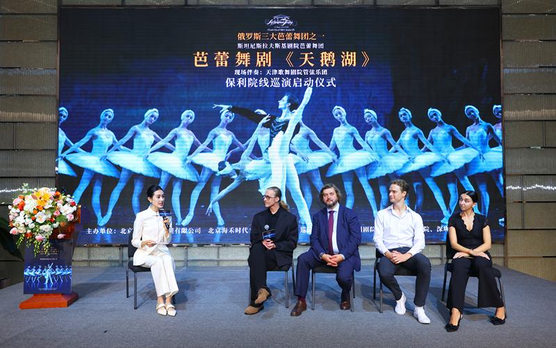 芭蕾舞剧《天鹅湖》保利院线巡演启动仪式现场,主持人与贵宾互动。贵宾左起:芭蕾舞团艺术总监马克西姆·塞瓦金、俄罗斯国夷易近艺术家斯坦尼剧场首席指挥菲利克斯·科罗博夫、斯坦尼剧场芭蕾舞团首席演员丹尼斯·德米特里耶夫、斯坦尼剧场芭蕾舞团首席演员/俄罗斯勋绩艺术家埃里卡·米基尔蒂切娃。