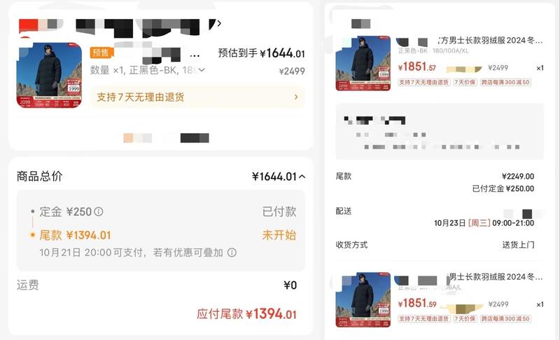 受限于平台纪律,潘磊只能先支出全副尾款。而这时掀开商品页面,两件羽绒服的预估患上手价也辩解酿成为了1851.57元以及1851.59元,比从前贵了200多元。