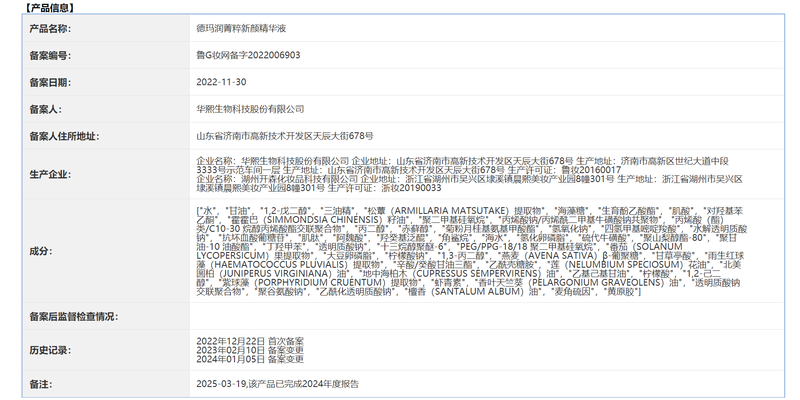 国产艰深化装品存案信息平台揭示,往年3月,华熙生物还实现为了德玛润菁粹新颜精髓液、德玛润菁粹净透洁面慕斯、德玛润晶润新颜冻干面膜等多款产物的2024年度陈说。
