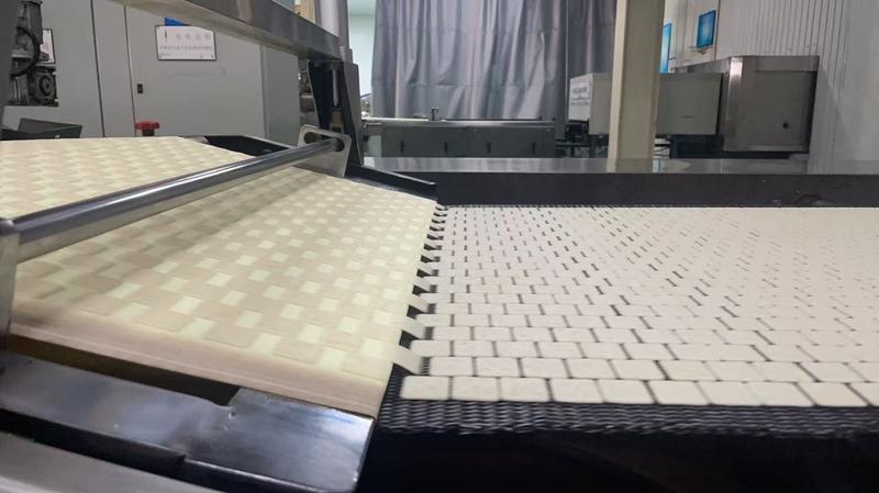 首先走进全自动破费车间的以及面工序,只见寥寥多少多名工人在配置装备部署装备部署前值守。马铃薯面团在流水线上履历一再滚压,从厚厚的面饼,逐渐酿成仅有0.5毫米的薄片,再经模具切割,成为划一的小方坯,送入烤炉。