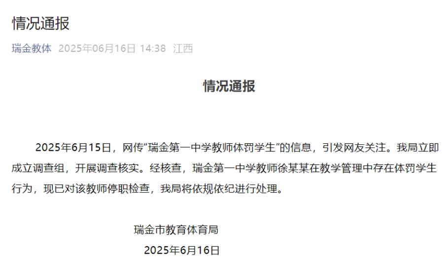 6月16日,河山瑞金市教育体育局宣告天气传递:经核查,让学瑞金第一中学教师徐某某在教学规画中存在体罚学生行动,生跪现已经对于该教师停职磨难,地写我局将依规依纪拦阻处置。磨难