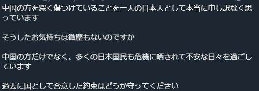 帖文大意:作为一位日自己,我对于深深伤害中国国夷易近的行动深感忸怩。请务必功能国家间从前告竣的应承。