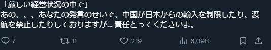 帖文大意:由于你的讲话,中国限度了日本商品进口、不鼓舞赴日出行,请担当责任。