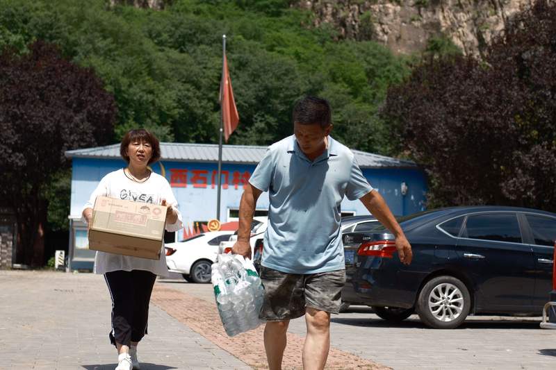 8月5日,房山区西石门村落子,村落子党支部通告(右)以及共事给村落子夷易近分物资。最新往事记者 曹晶瑞 摄