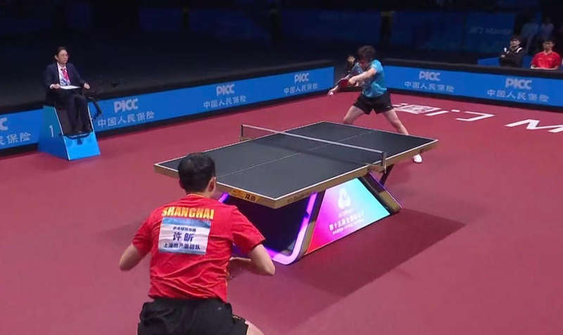 第二场角逐中,上海队的樊振东8-十一、11-七、11-三、11-9打失败京队的王楚钦,两队总比分1比1战平。
