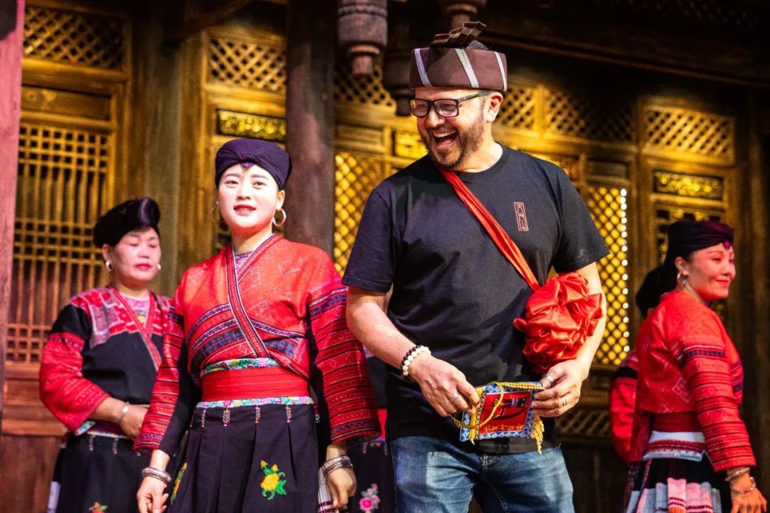 ▲在广西桂林龙胜各族自治县龙脊镇黄洛瑶寨,外国游客与村落子夷易近演员在红瑶夷易近俗横蛮饰演中互动。热搜图/新华网