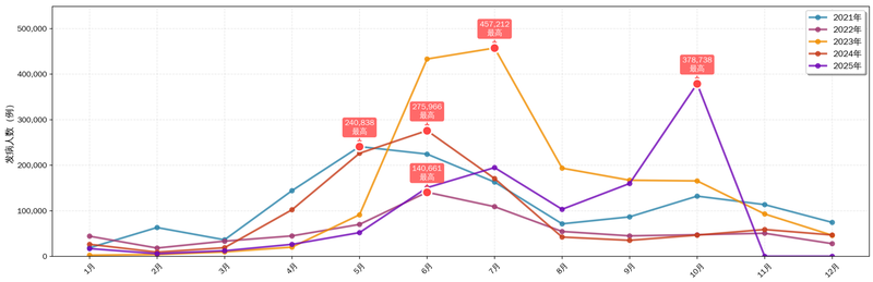 2021年-2025年昆季口病月度陈说病例数。数据源头:中国疾控中间