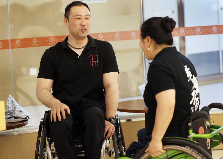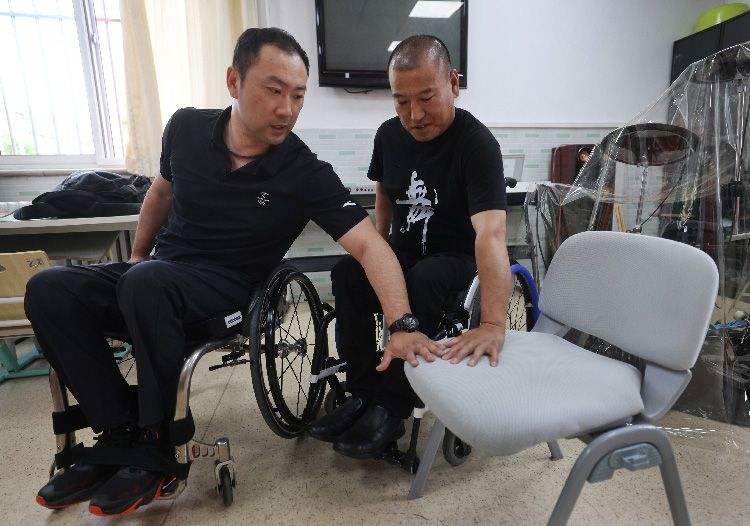 5月17日,李辉教队友从轮椅车挪移到座椅上的措施方式。